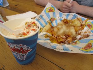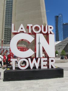 They were having a summer promotion, that if you bought a funnel cake you got a free twister (their version of a blizzard or McFlurry). AND you could get 10% off your purchase with an SPC card. So we got a funnel cake with caramel sauce, icing sugar, and apples, with a Reese’s Pieces Twister, for only $10! Pretty good deal! Then while we were sitting in the place a parade of Military Veterans went by with army trucks and an escort of police. I am assuming it was because of the holiday. Then we went to the CN Tower! We bought the Sea the Sky Promo tickets in advance online,